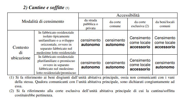 Se guardi sotto lo schema trovi (1) Si fa riferimento ai beni disgiunti dall' unità abitativa principali, ossia....... Per cui parla di unià abitativa. Ma penso che sia ancora più chiaro con la nota prot.38500m del 04-06-2020 OGGETTO: Ulteriori chiarimenti ed istruzioni in tema di autonomo censimento in catasto delle cantine e delle autorimesse (cfr. punto 3.3.2 della circolare n. 2/E del 1° febbraio 2016). Continuano a pervenire alla scrivente Direzione Centrale richieste di chiarimento in merito all’autonomo censimento in Catasto delle cantine e delle autorimesse autonomamente fruibili e non direttamente comunicanti con le unità abitative presenti nell’edificio, nonostante sull’argomento siano state già fornite indicazioni con la circolare n. 2/E del 1° febbraio 2016 (cfr. punto 3.3.2) e ulteriori precisazioni con nota prot. n. 60244 del 27 aprile 2016. Al fine di uniformare il comportamento degli Uffici Provinciali – Territorio competenti (nel seguito UPT), occorre rimarcare che la finalità perseguita al punto 3.3.2 della circolare sopra richiamata “…è quella di non procedere più all’accatastamento di tali beni [cantine e autorimesse], autonomamente fruibili e non direttamente comunicanti con le unità abitative presenti nell’edificio, come maggiore consistenza di tali unità residenziali, ossia come accessori complementari delle stesse, dovendosi invece procedere al loro autonomo censimento” A mio avviso parla sempre di unità abitative o residenziali, per cui escludendo negozi ed uffici. Saluti