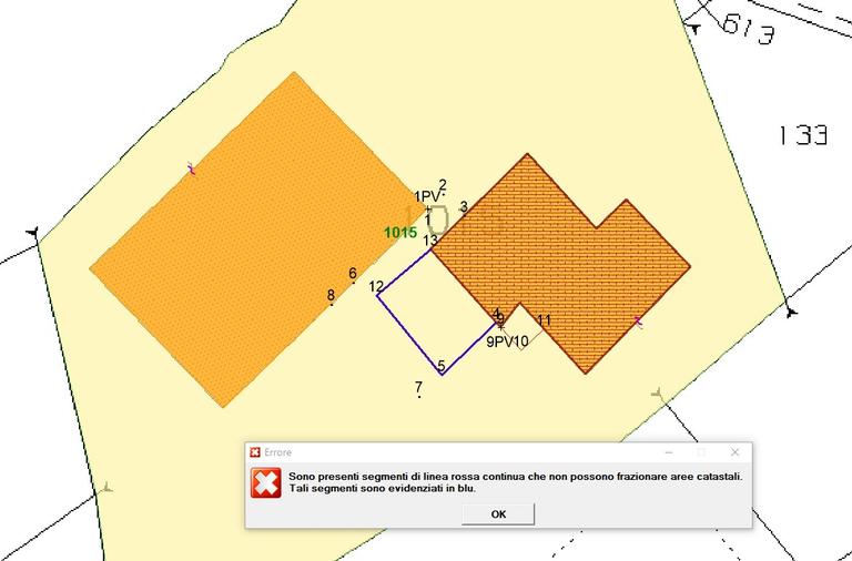 ecco l'immagine ingrandita (scusate ma è la prima volta che provo a caricare un'immagine sul forum) i.postimg.cc/sgqzK2WK/Immagine-2025-11-0... errore : sono presenti errori di linea rossa continua che non possono frazionare aree catastali 9|1000|10|10|10|PREGEO 10.00-G,APAG 2.15|TM|Nota: | 6|modesta entita| 8|1|-1417.672|805.374|p| 8|2|-1416.845|806.228|p| 8|3|-1418.050|807.415|p| 8|4|-1424.004|809.178|p| 8|5|-1426.932|806.142|p| 8|6|-1421.776|801.218|p| 8|7|-1428.147|804.882|p| 8|8|-1423.004|799.971|p| 8|9|-1424.293|809.438|p| 8|10|-1425.559|810.577|p| 8|11|-1424.381|811.870|p| 8|12|-1422.5|802.5|p| 8|13|-1419.931|805.514|p| 7|4|4|5|12|13|RC| 7|3|9|10|11|RC| 7|1|1|PV| 7|1|9|PV|